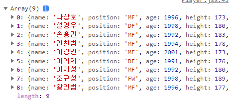 (console창)React 서버로 받아온 선수정보리스트 확인