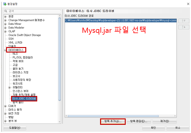 - Oracle 환경설정-데이터베이스-타사 JDBC 드라이버-항목추가-Mysql.jar파일 선택