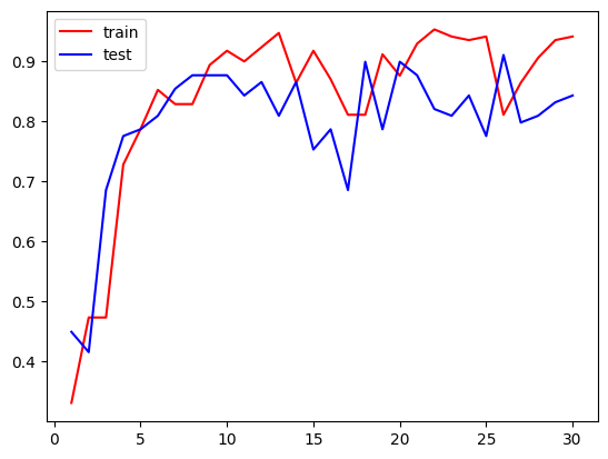 plt.plot(ep, h1.history['accuracy'], color='red', label='train')