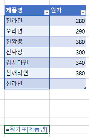 구조적 참조방식으로 '=원가표[제품명]'과 같이 간단하게 범위를 선택할 수 있다.