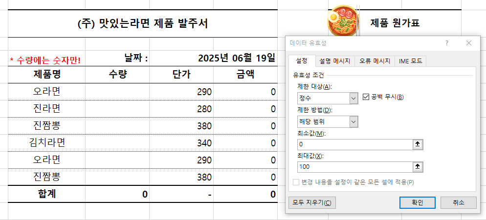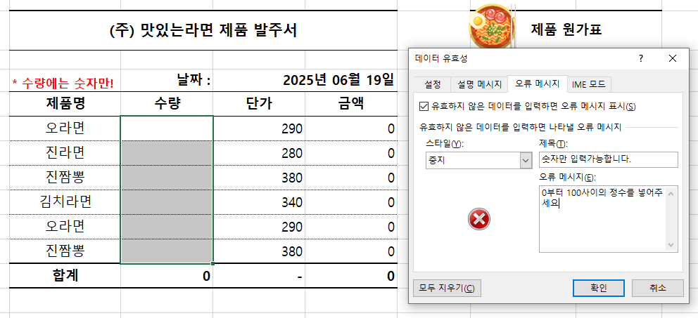 수량을 쓸 때 숫자만 입력하게 하려면 마찬가지로 데이터 유효성 검사에서