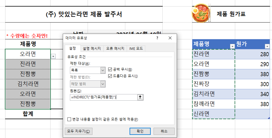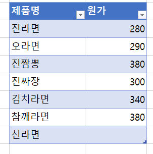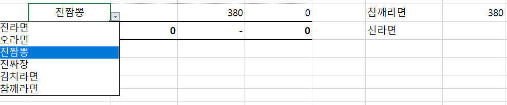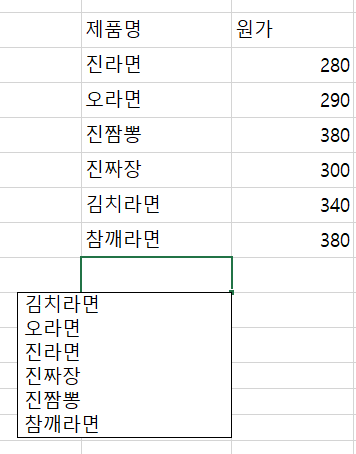 제품명에 정해진 라면 종류만 기입하게 하려면 목록상자를 활용하면 된다.