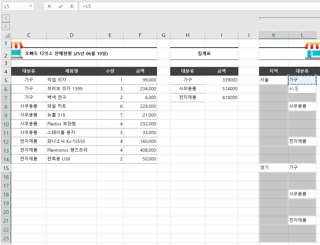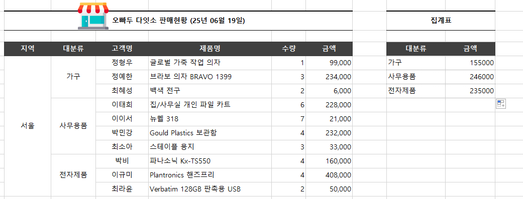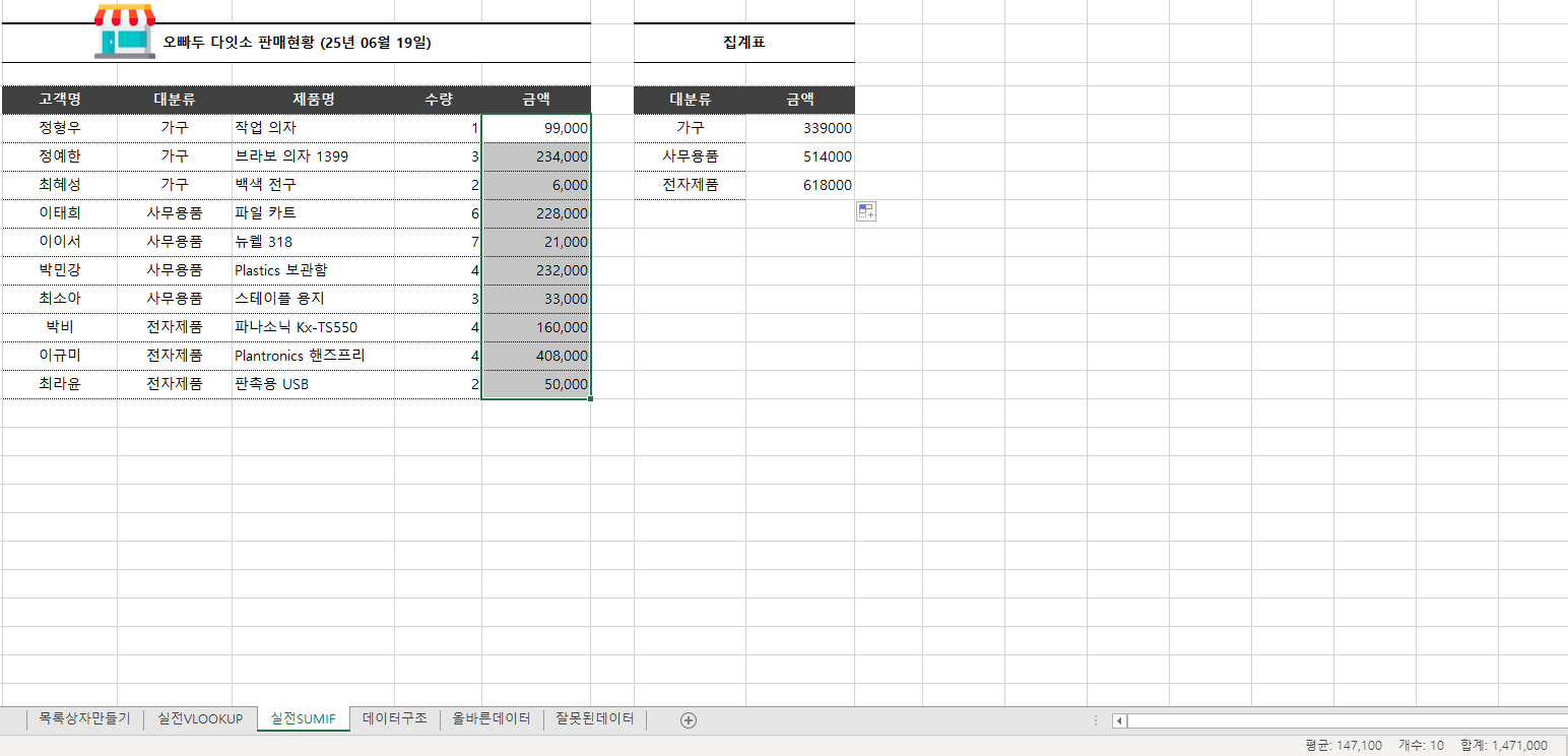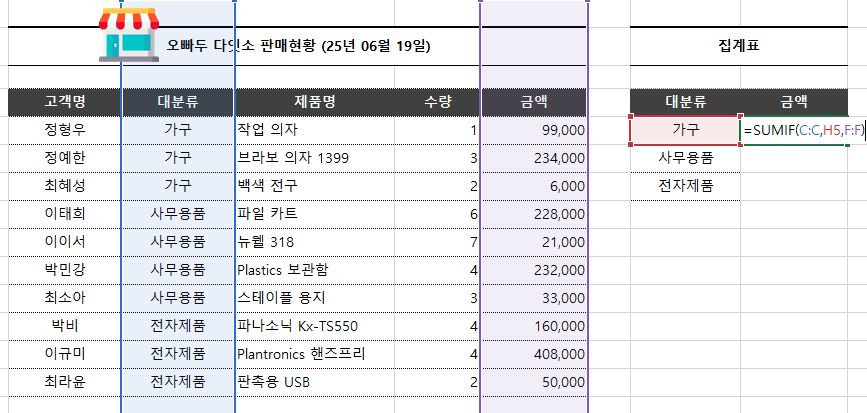 그리고 SUMIF(원본 대분류 범위, 집계표 대분류, 원본 금액 범위)를 입력하면 된다.