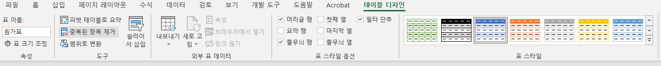 표 이름은 표에 커서를 두어 테이블 디자인 탭을 활성화시켜 '표 이름'에서 설정해주면 된다.