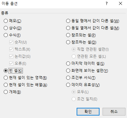 2. 범위 전체 선택 후 Ctrl+G 입력-옵션 클릭-빈 셀 선택