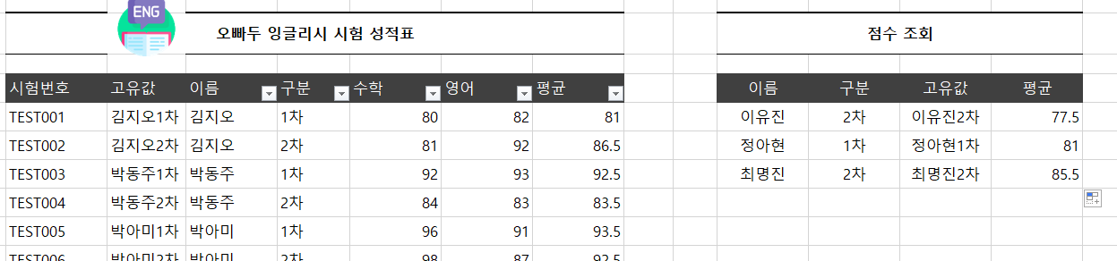 아래와 같이 이름과 시험 구분에 일치하는 평균을 구하려고 한다면
