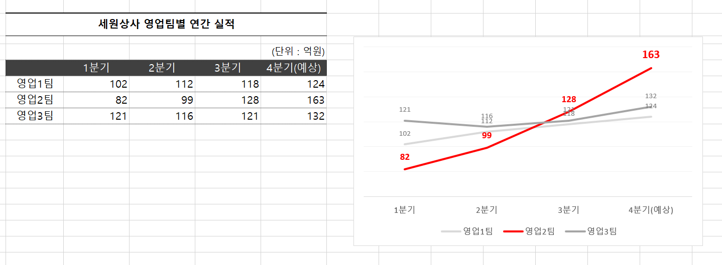 영업 2팀의 실적이 가장 좋기 때문에 영업 1팀과 3팀의 꺾은선과 데이터레이블을 연한 색으로 변경하고