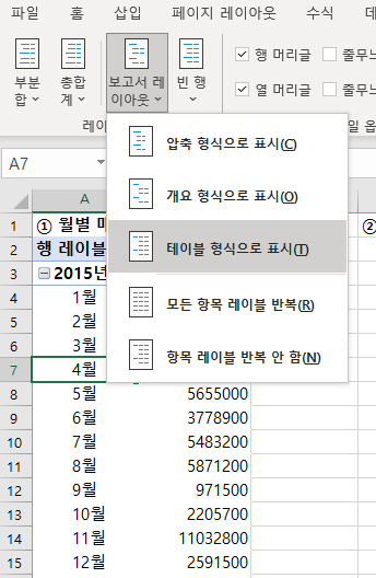 '테이블 형식으로 표시'를 클릭하여 연도와 월을 구분해준다.