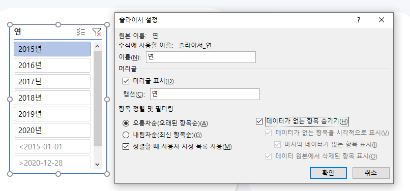 데이터가 없는 항목을 숨기고 싶은 경우 슬라이서 우클릭-슬라이서 설정에서