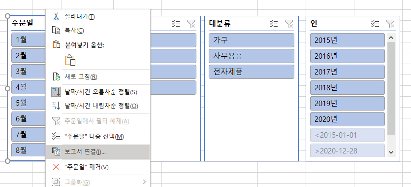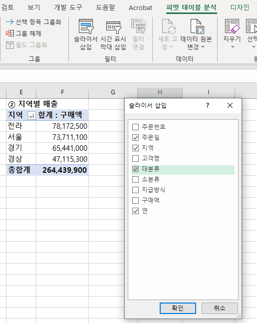 피벗테이블에 커서를 둔 상태에서 피벗 테이블 분석 탭-슬라이서 삽입을 선택한 후 원하는 항목을 체크한다.