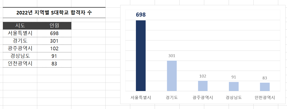 서울특별시의 꺾은선과 데이터레이블을 진한 남색으로 변경하여 서울특별시의 합격자 수를 강조한다.