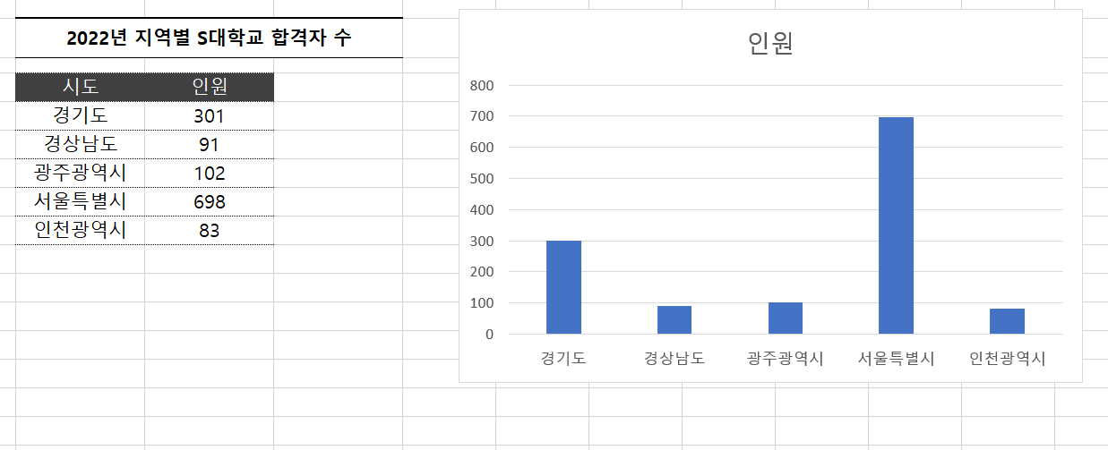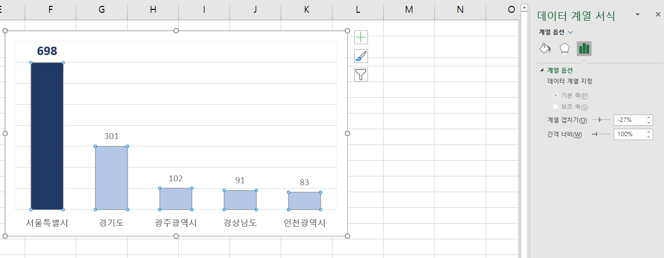 막대 우클릭-데이터 계열 서식 클릭 후 간격너비를 100%로 변경하면 막대너비가 넓어져서 보기 편해진다.