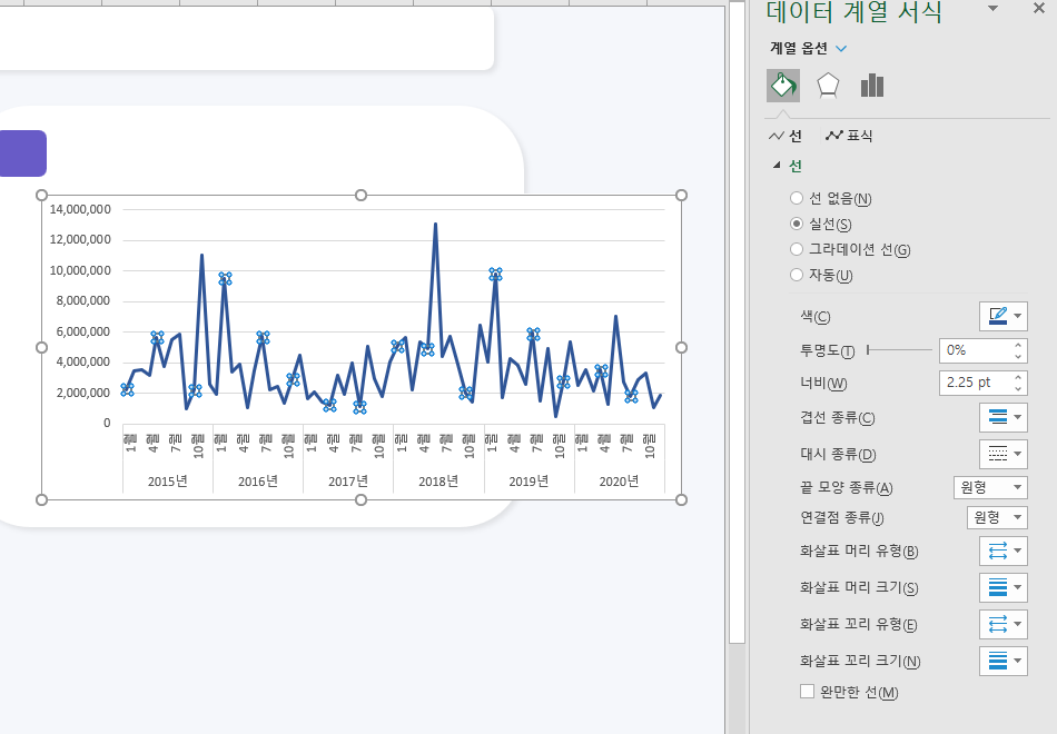 꺾은선 차트는 기본적으로 뾰족하게 설정되는데, 데이터 계열 서식에서 완만한 선을 체크하면 부드럽게 변화된다.
