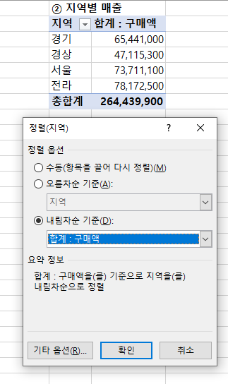 지역 필터를 클릭하고 '기타정렬옵션'을 클릭한 뒤 내림차순 기준을 선택하고 합계:구매액 기준을 선택한다.