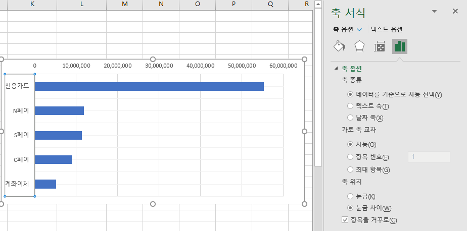 - 원본데이터와 차트의 항목순서가 항상 반대로 정렬되므로 세로축 서식에서 '항목을 거꾸로'를 선택해