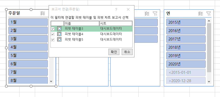 슬라이서는 커서를 둔 피벗테이블에만 적용되는데 모든 피벗테이블이 변경되게 하려면