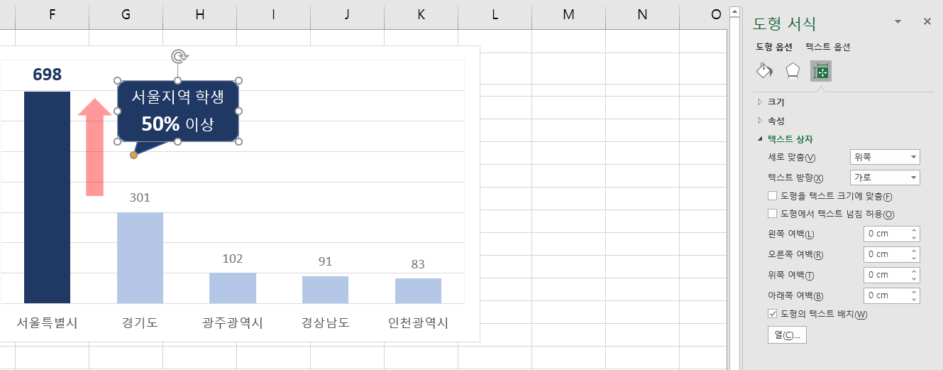 빨간색 화살표를 추가하고 말풍선 상자에 서울지역 학생 50% 이상을 입력하여 서울특별시 합격자 수를 강조해준다.