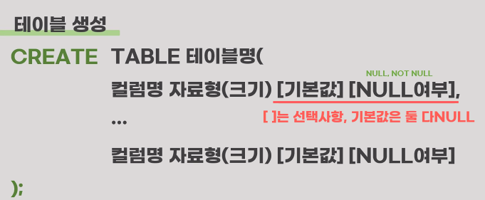 ALTER TABLE 테이블명 ADD 컬럼명 자료형 [기본값] [NULL여부];