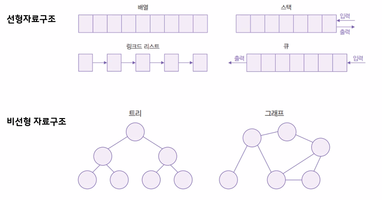 1. 자료구조: 프로그램에서 쉽게 활용될 수 있도록 논리적으로 설계된 데이터 구조 및 관계, 데이터의 유형, 업무상황에 따라 다양한 형태의 자료구조 선택해 활용가능, 데이터들을 쉽게 정리하고 쉽게 불러올 수 있음