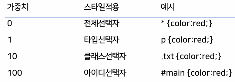4. 선택자의 우선순위(명시도): 아이디 선택자>클래스 선택자>타입선택자>전체선택자