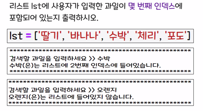 print(f"{fruit}(은)는 리스트에 {lst.index(fruit)}번째 인덱스에 들어있습니다.")