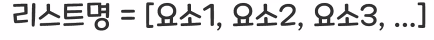 -기호 [](대괄호) 사용, 리스트 내부의 값은 ,(콤마)로 구분