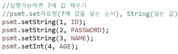 - SQL문장 속 ?에 값 입력하기: set자료형(? 순서, 컬럼명)(pst.)