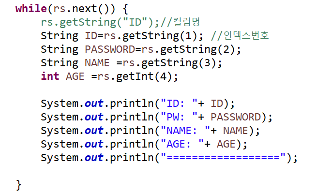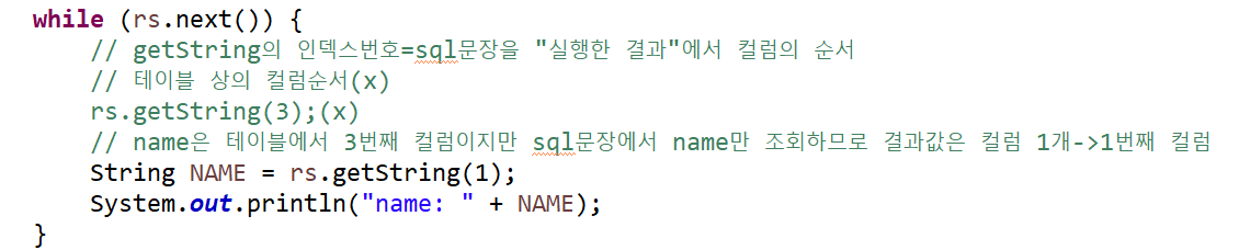 - ResultSet: 커서객체, 행 한 줄만 반환next(): 다음 줄로 커서를 옮기는 메소드