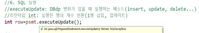 - SQL문장 실행하기: excuteUpdate(pst.)