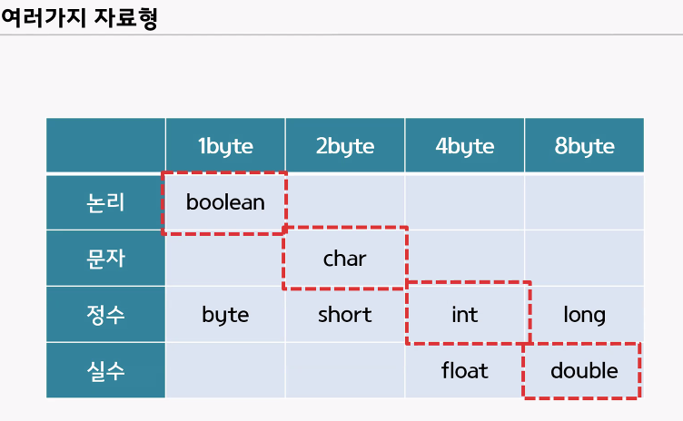 - 변수 생성(할당, 선언): 대입한 값을 변수에 저장한다. 변수명 앞에 자료형을 입력해야 한다.