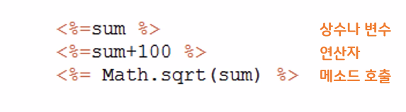 2)표현식: 웹 브라우저에 결과값을 출력하기 위한 부분(상수, 변수, 연산자, 메소드 호출)