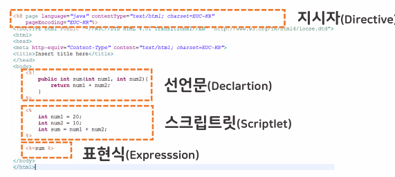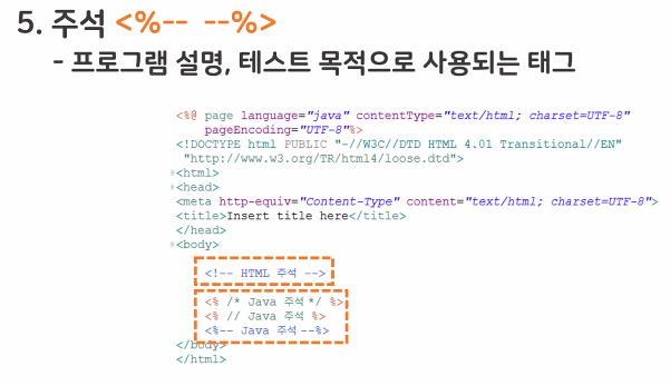 1)스크립트릿: JAVA 코드를 작성하는 부분, JSP는 HTML 기반이므로 줄여가는 것이 좋음