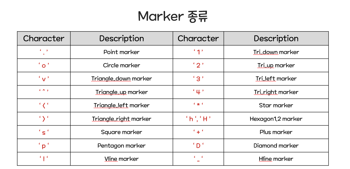 - marker 모양 사용자 지정: marker=’$원하는 기호$’
