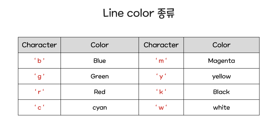 - 선의 색깔 설정: color='색깔 첫 글자'