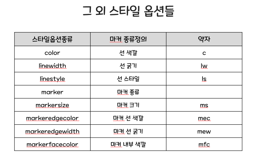 - marker의 테두리 색깔(marker edge color) 지정: mec=’색깔 첫 글자’