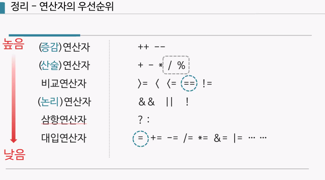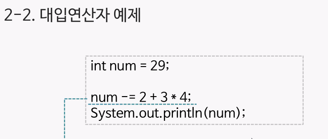- 대입연산자는 산술연산자보다 늦게 처리된다(산술된 후 값이 변수에 대입된다.).