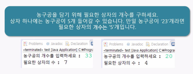 System.out.print(“필요한 상자의 수: “ + ( ball/5 !=0 ? ball/5+1 : ball/5);