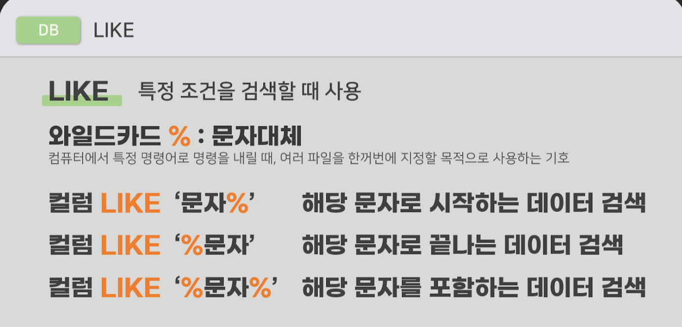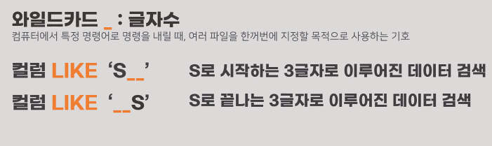 와일드 카드: %(글자 수 제한 없음), _(입력값 만큼 글자 수 제한있음)