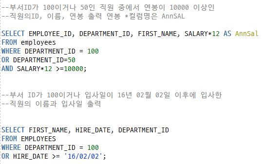 논리연산자 우선순위: AND>OR, OR조건을 우선실행하려면 ( ) 입력