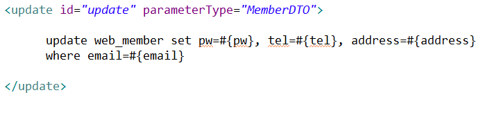- sql문장 실행하기: int cnt=session.update(“update”, dto);