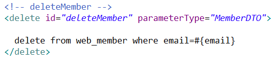 - sql문장 실행하기: session.delete(“deleteMember”, dto)