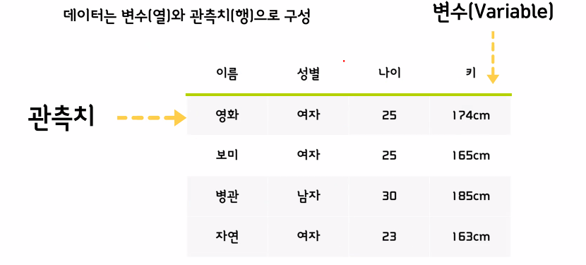 -범주형: 관측치들을 카테고리화한 데이터 예)나이를 10대, 20대, 30대로 나눔