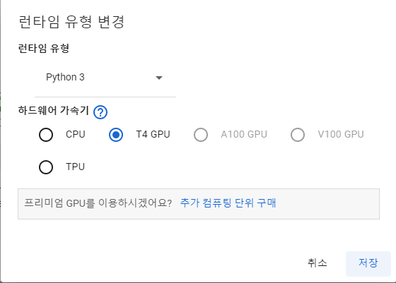 - 런타임-런타임 유형 변경-T4 GPU(대용량 데이터 처리