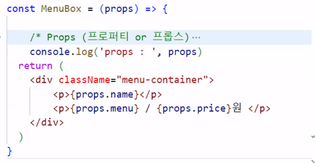 -컴포넌트는 함수 형태이기 때문에 함수의 매개변수를 통해 값을 받음