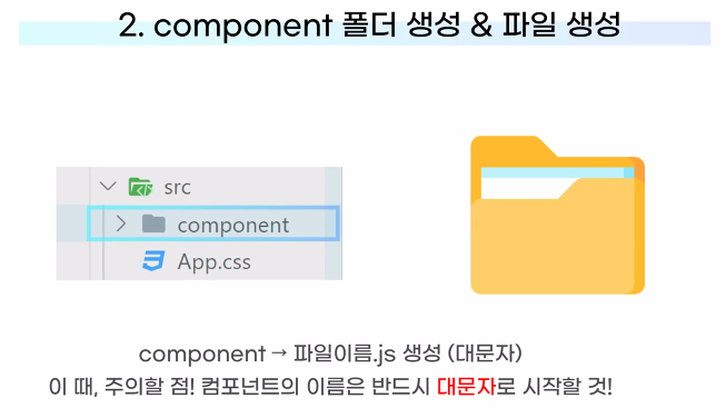 - 반드시 컴포넌트는 대문자로 시작해야 함: 기존 HTML 코드(DOM 요소)와 구분해야 함