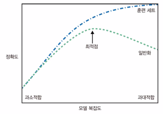 - 과대적합(Overfitting): 지나치게 상세하고 복잡한 모델링을 하여 훈련세트에만 과도하게 동작하는 모델, 테스트 세트의 성능 저하