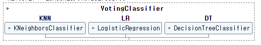 #estimators: 사용할 단일 모델들을 리스트 형식[(key, value)]으로 정의(KNN,DT,LR)