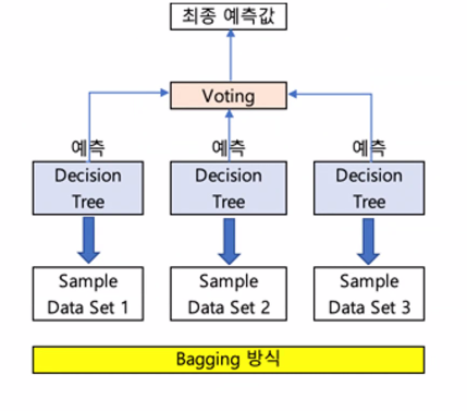 2)Bagging: 같은 알고리즘으로 여러 개의 모델을 만들어서 투표를 통해 최종예측, 결과를 결정하는 방식