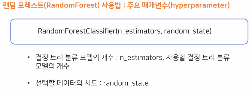 - 다양한 트리를 만드는 방법: 데이터 무작위 선택, 노드 기준 특성 무작위 선택