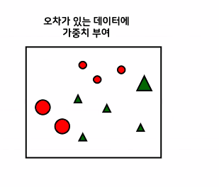 - 처음 모델이 예측을 하면 예측결과에 따라 잘못 분류된 데이터에 가중치 부여